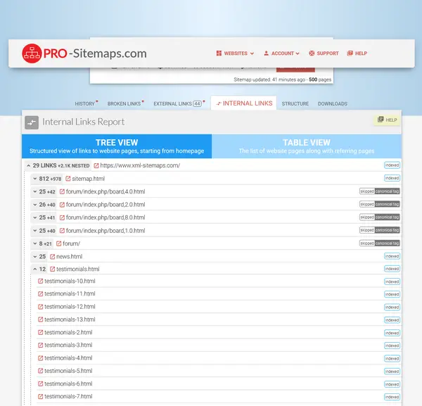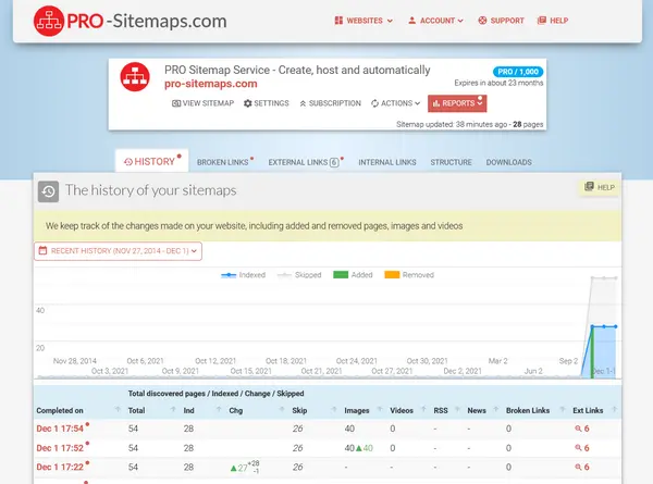 - You will gain access to in-depth reports such as the Site history, Broken links, Internal and External links, Site Structure and more, we will also create and maintain Images, Video, News sitemaps and RSS feed for you.